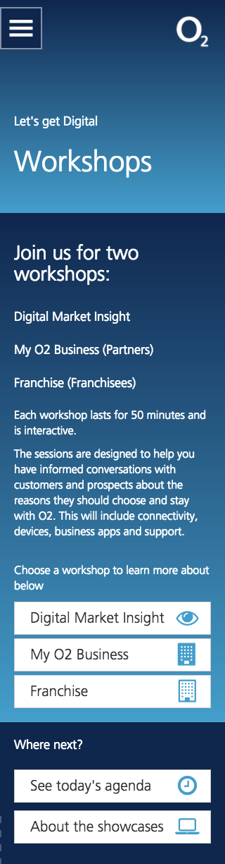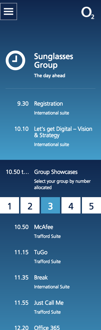 Originally developed for quite a complex event with between five and ten sessions running at the same time. The web app allows a dynamic agenda, each user was given a colour and number (on their name badge) and was shown a different agenda depending on the colour/number selected.